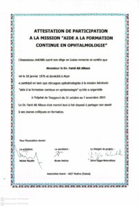 Spécialiste du segment antérieur basé en Algérie, le Dr Farid Ait Allaoua conjugue rigueur clinique et innovation technologique pour offrir une prise en charge d’excellence. Expert reconnu en phakoémulsification et en chirurgie réfractive, il collabore avec des leaders mondiaux comme Cristalens International pour introduire des solutions de pointe, telles que les lentilles premium Artis Symbiose, au service de la santé visuelle de ses patients.